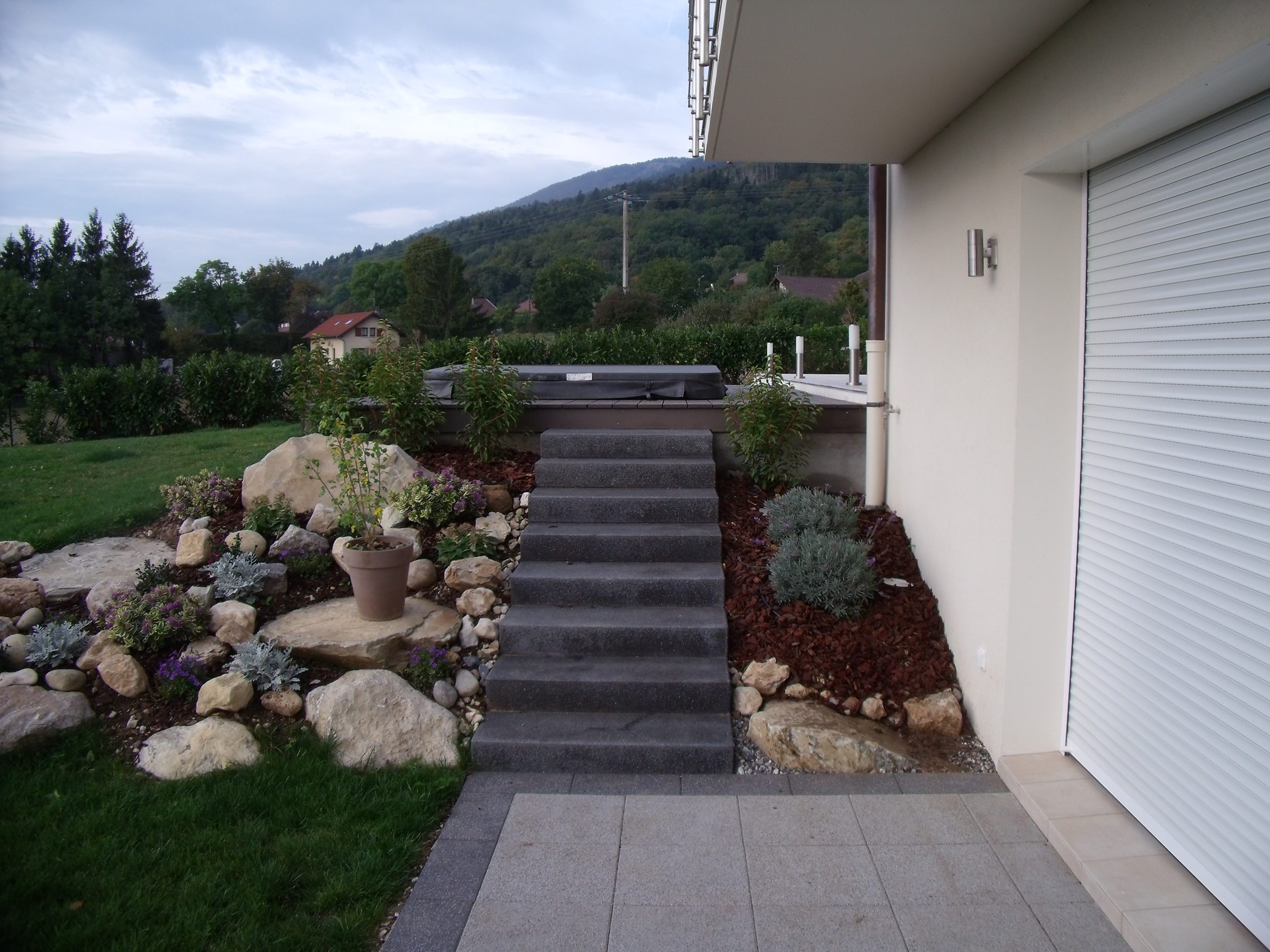 La maçonnerie paysagère regroupe diverses prestations, telles que la réalisation de terrasses (en grès cérame ou pierre naturelle), le soutènement des terrains (avec pré-murettes ou murs en L) ainsi que la création d’escaliers extérieurs.
